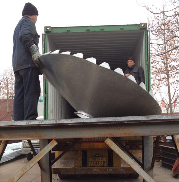 安裝時,根據(jù)倉徑的大小,采用多個吊裝架,吊裝架上固定一個手動葫蘆,使用特制的吊板用螺栓固定在倉壁墻板上,緩緩提升倉體。采取自上而下的安裝方式,即先安裝頂蓋、上層墻板,然后在裝中層墻板,再裝下層墻板,后將整個倉固定在基礎(chǔ)上。筒倉的構(gòu)件全部采用高強度螺栓連接,安裝方便、迅速、可靠。