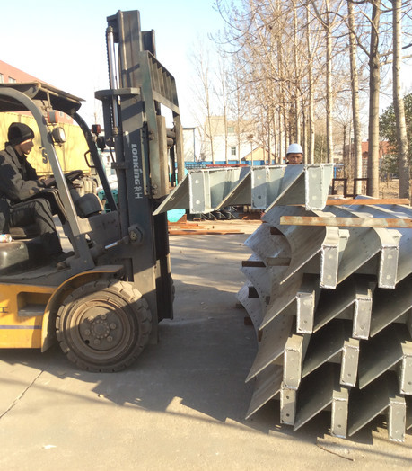 安裝時,根據(jù)倉徑的大小,采用多個吊裝架,吊裝架上固定一個手動葫蘆,使用特制的吊板用螺栓固定在倉壁墻板上,緩緩提升倉體。采取自上而下的安裝方式,即先安裝頂蓋、上層墻板,然后在裝中層墻板,再裝下層墻板,后將整個倉固定在基礎(chǔ)上。筒倉的構(gòu)件全部采用高強度螺栓連接,安裝方便、迅速、可靠。