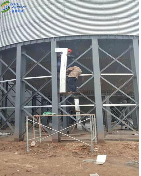 此項(xiàng)目為山東煙臺(tái)地區(qū)飼料廠鋼板倉改造加倉工程,客戶原有2臺(tái)鋼板圓筒倉,用了很多年,現(xiàn)由于生產(chǎn)規(guī)模擴(kuò)大需加倉3臺(tái)1500噸玉米倉,在歷經(jīng)不到2個(gè)月左右的安裝施工,近期終于迎來了收尾工作。